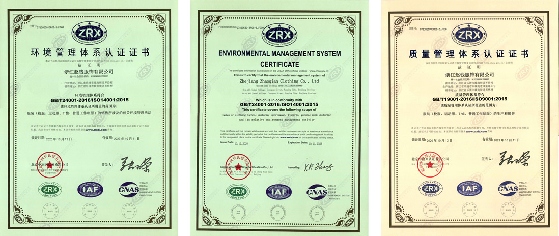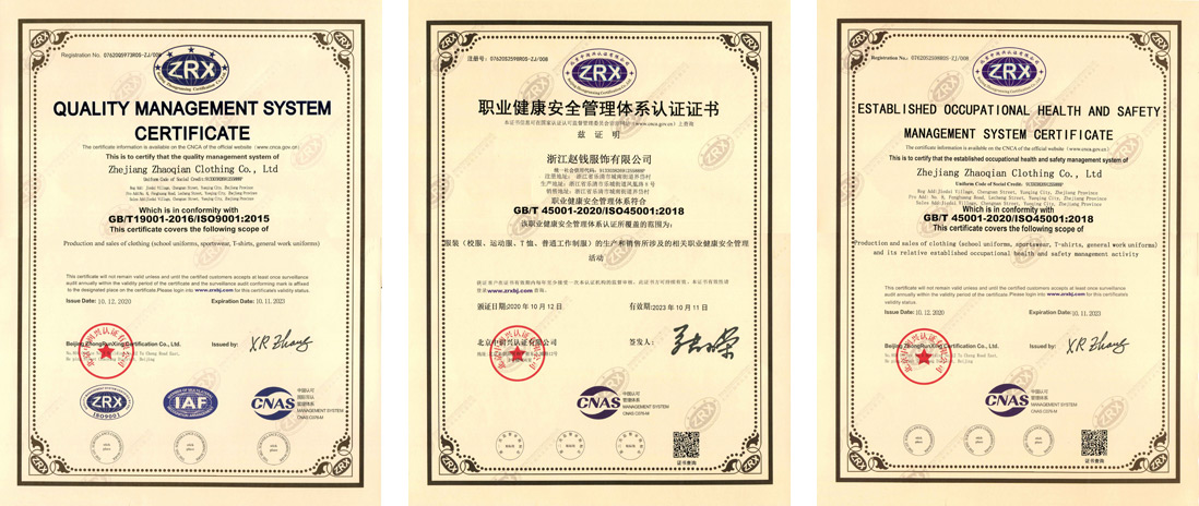 趙錢服飾有限公司將優(yōu)秀的設(shè)計生產(chǎn)化作企業(yè)自身的追逐信仰,在選料上精益求精,在設(shè)計上考究全面,在生產(chǎn)上一絲不茍,企業(yè)先后通過《質(zhì)量管理體系認(rèn)證》《職業(yè)健康安全管理體系認(rèn)證》《環(huán)境管理體系認(rèn)證》等多個認(rèn)證資質(zhì),以做讓各界人士放心的合作伙伴。
